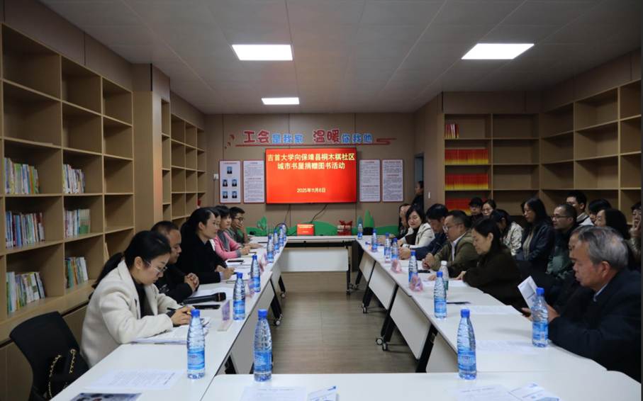 捐赠仪式在桐木棋社区城市书屋举行,由保靖县文旅广电局副局长梁万星主持。社区党支部书记杨帆首先汇报了城市书屋建设及全民阅读推广成果,并对我校的文化帮扶表达诚挚感谢。校工会常务副主席柴绪亮表示,此次活动是校地携手推动乡村文化振兴的有力举措,学校将持续以文化为乡村振兴赋能。随后,我校图书馆馆长唐石代表学校捐赠957册图书,杨帆接收捐赠。吴春艳在讲话中表示此次活动为乡村文化注入新活力,期待校地开展多方面的合作。